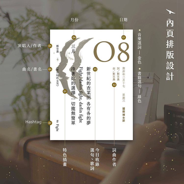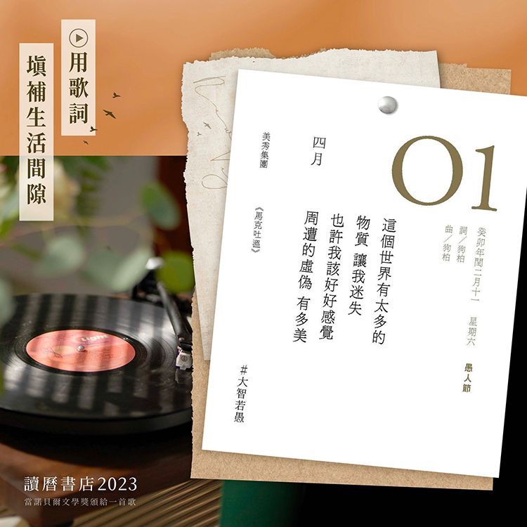 讀曆書店五週年之際,開放收錄的文體, 首度將歌詞納為展品。讓腦海中不斷重複播放的歌詞,繡在靈魂上的那句話,透過讀曆書店得以收藏。