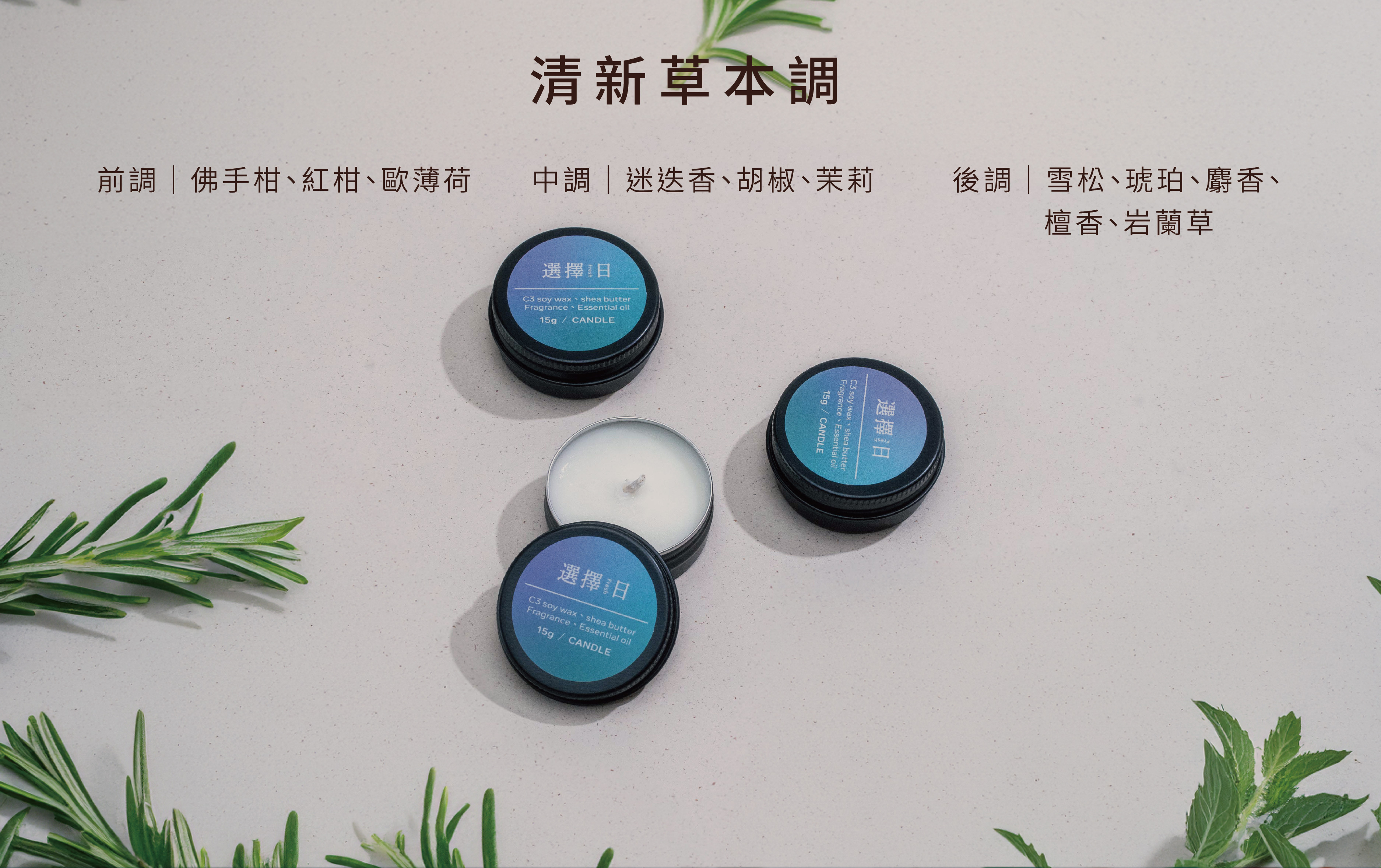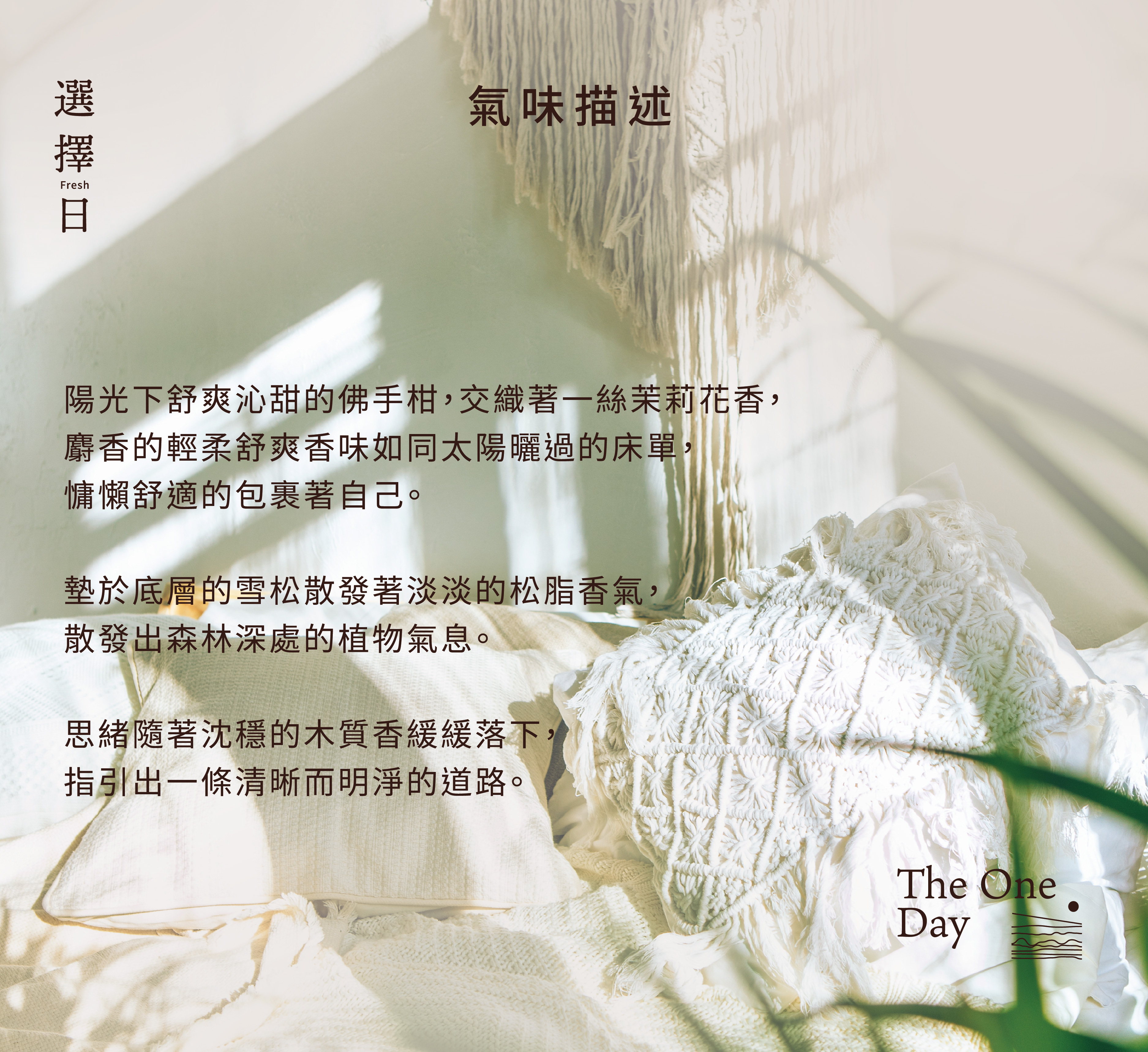 清新調:佛手柑、歐薄荷、迷迭香、茉莉、雪松、麝香、廣藿香