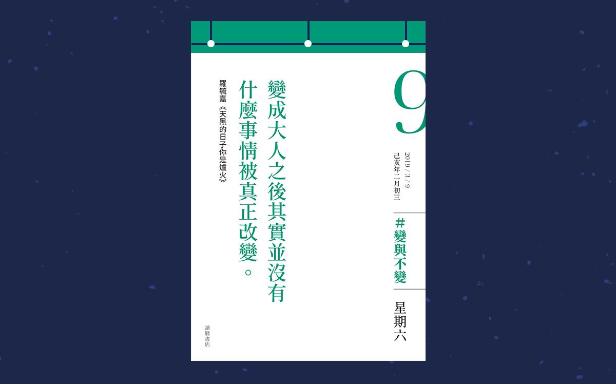 有手機,有電腦能提醒時間,為何還需要一本桌曆?因為「讀曆書店」不只能紀錄時光,透過台灣原創的文字演繹,它能賦予時光不同意義。翻開:「變成大人之後其實並沒有什麼事情被真正改變。」