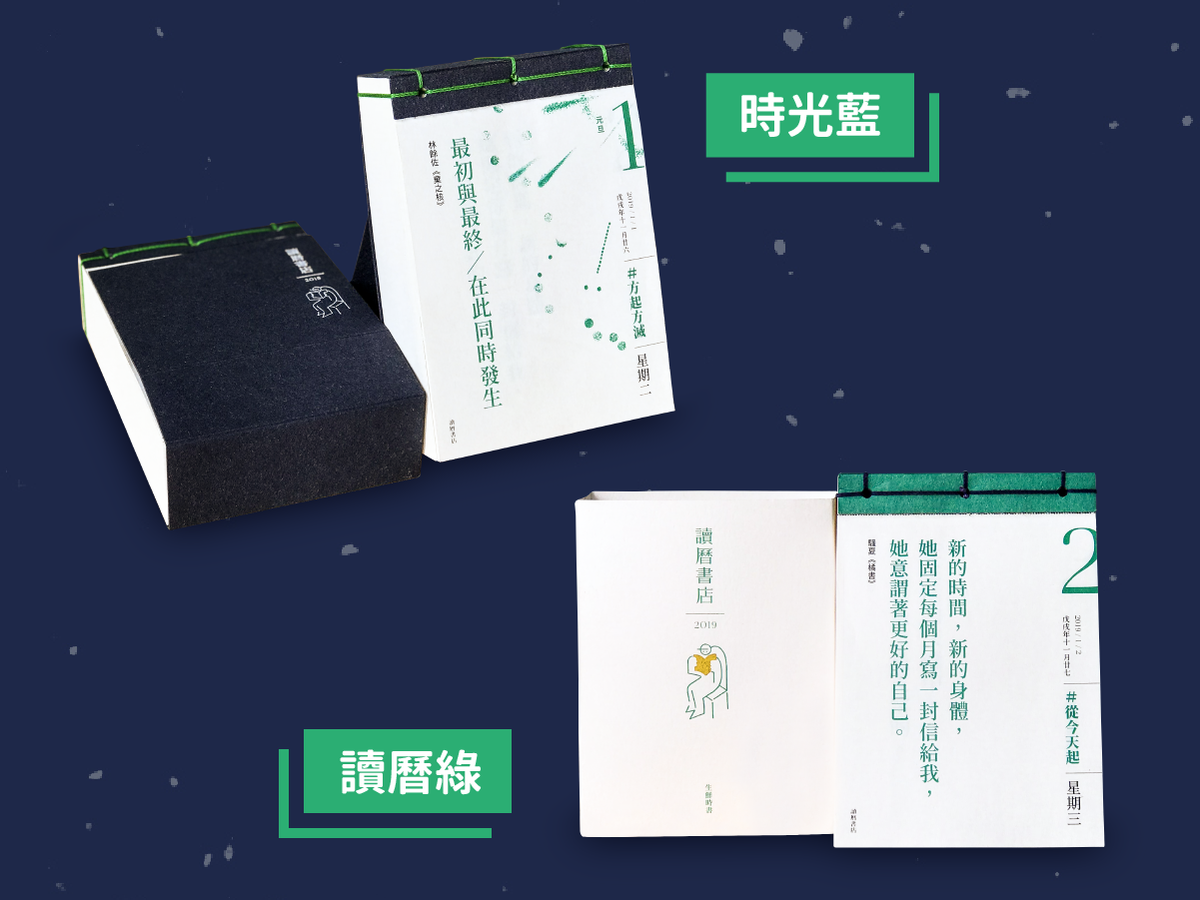 「讀曆綠」:閱讀,越是綠意盎然、「時光藍」:藏書,亦藏時光,兩種封面顏色,多一種選擇,提高生活的自主性,讓你的桌上書店更有新意。