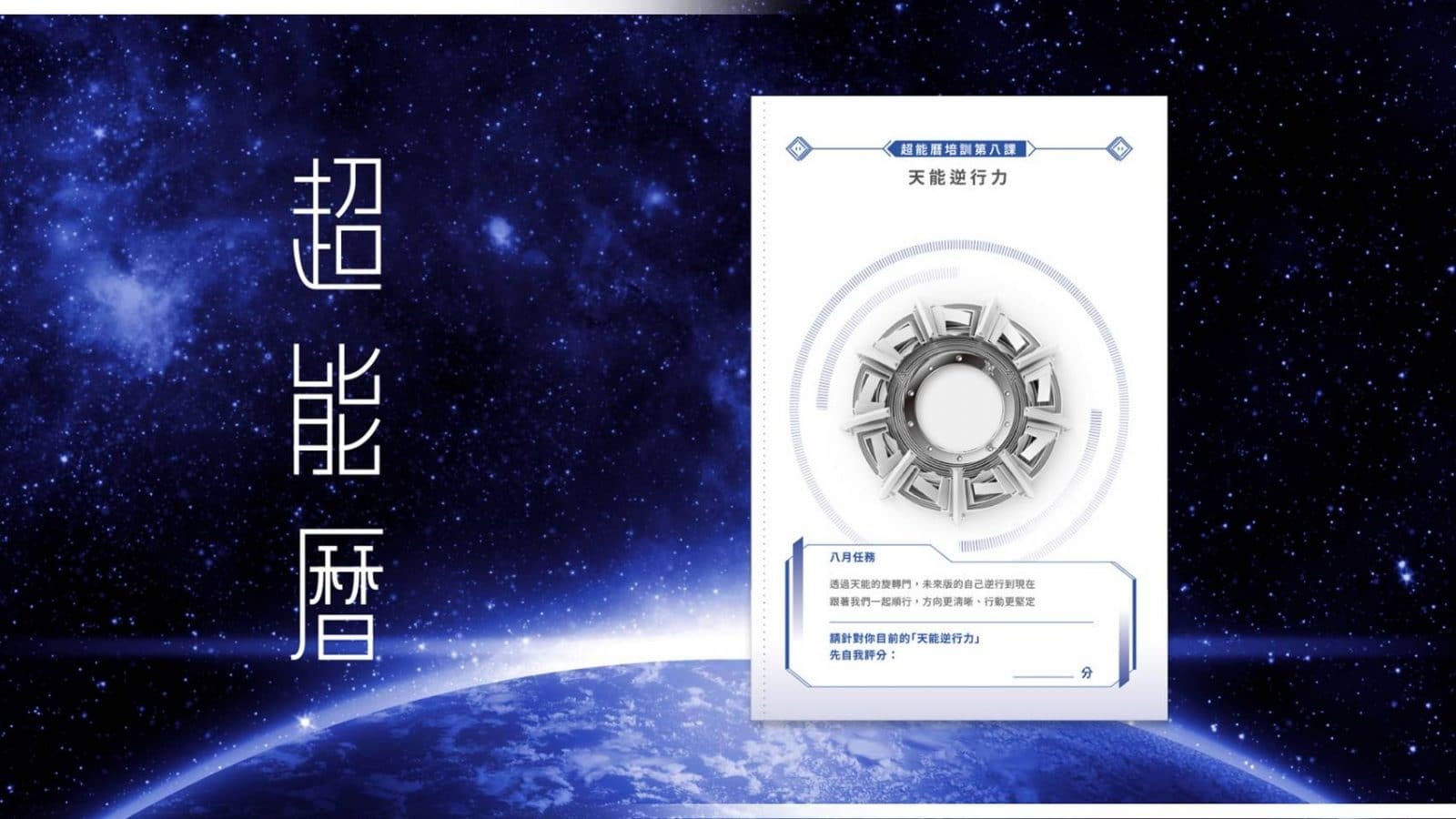 天能是天命之下的能力,是你自己本身就帶有的能力。天能逆行的概念,是電影《信條》中從旋轉門出來的未來人,教大家怎麼用一個月的時間練習和未來自己的視野做會面和聚焦。