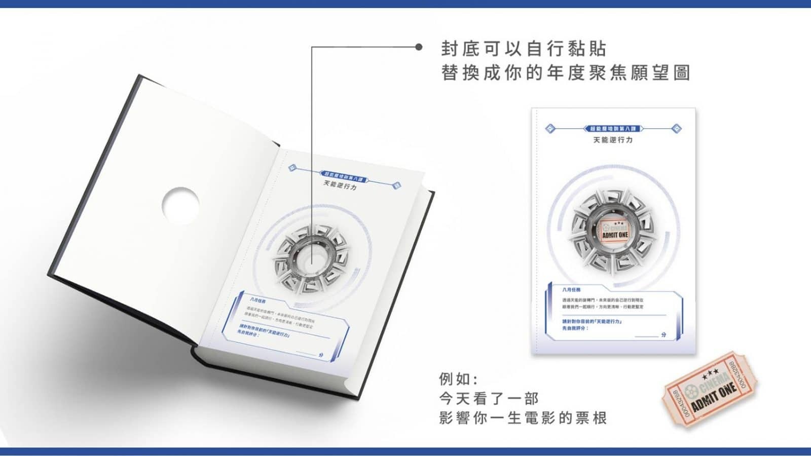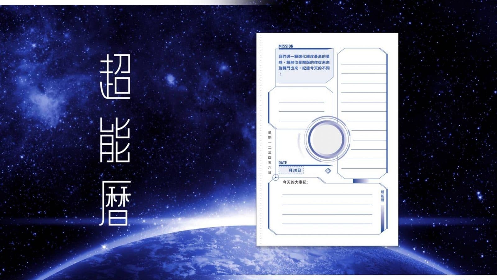 《超能曆》封面以「未來的你」與「現在的你」在此刻相遇的概念,封面中間的洞是太空艙的視窗,但可以替換成你的年度聚焦願望圖。
