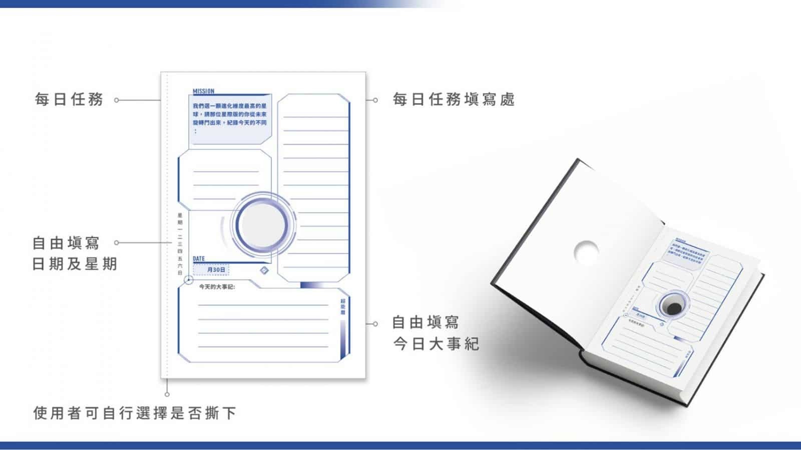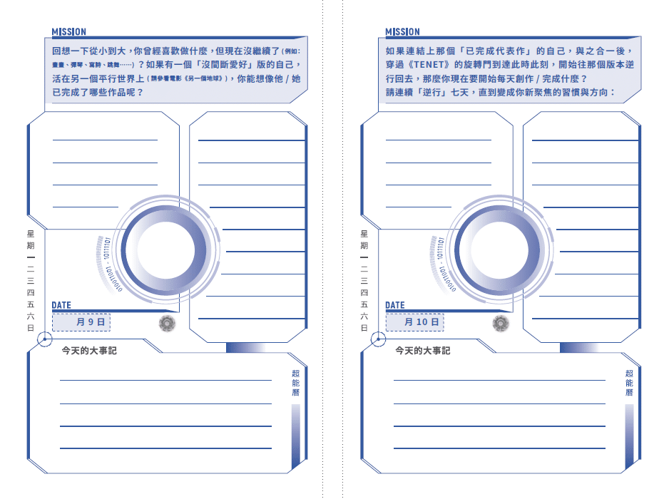 每一內頁中間的洞就像是蟲洞,讓你每天選擇你要的版本,直接進行「無地表障礙」的穿越,只需要記得每天貼上你當日的願望聚焦圖,或是代表非凡今天的象徵紀念圖。