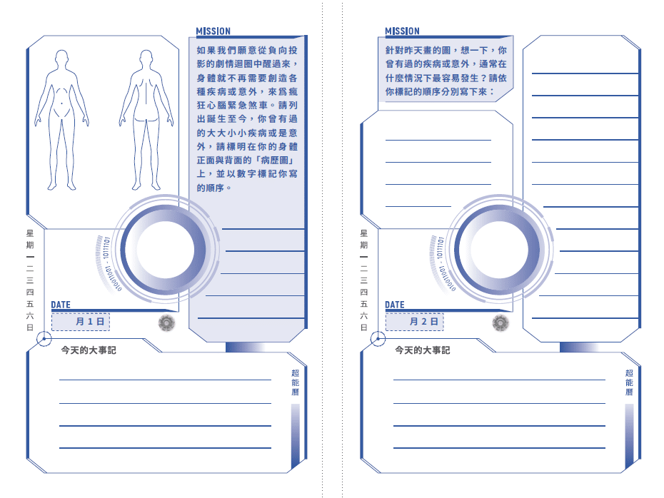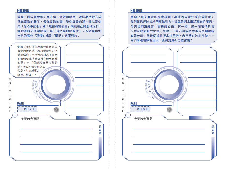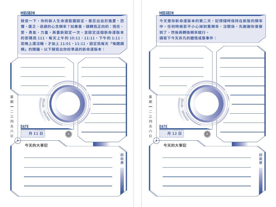 每天每一頁欣頻老師都安排了特定的身心靈升維任務,只要你每天完成一個小任務,積沙成塔,等到年底時你再回頭看年初的出發原點,就會發現《超能曆》已經帶你飛抵人生至今最高的意識海拔。
